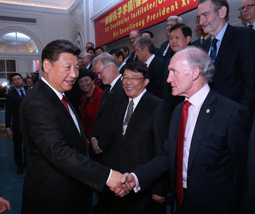 習近平指出,近年來,孔子學院在英國快速發展。目前,英國已經建立起29所孔子學院和126個孔子課堂,數量居歐洲之首。全英孔子學院取得的碩果也是中英人文交流蓬勃發展的縮影。通過人文交流,中英兩國文化中的精華正在對兩國人民的思維方式和生活方式產生著奇妙的“化學反應”!盀橹粎,誨人不倦!毕M谧魑唤處熢俳釉賲,為中英友好事業添磚加瓦。希望孔子學院繼續秉承“相互尊重、友好協商、平等互利”的校訓,為傳播文化、溝通心靈、促進世界文明多樣性作出新的更大貢獻。