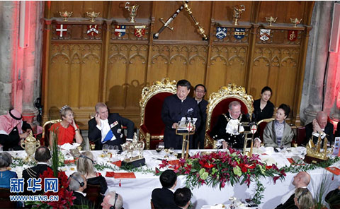 10月21日晚上,習近平在倫敦金融城市長晚宴上發表演講。