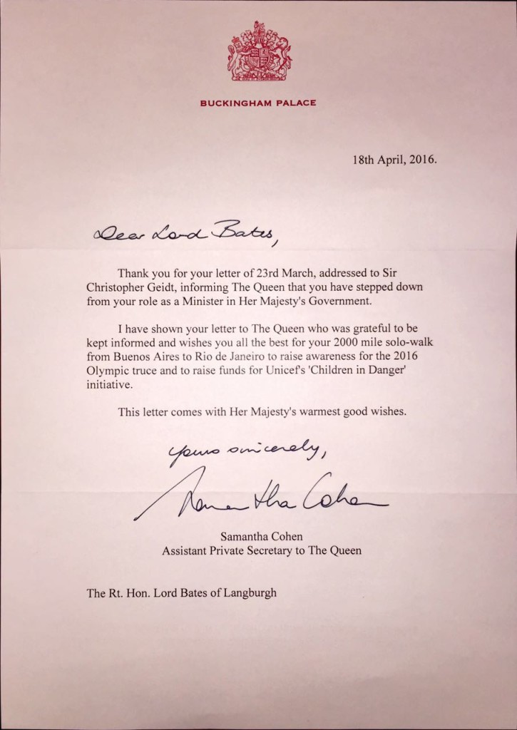 我已經將您的信呈交女王陛下閱覽,她對您的來信表示衷心感謝。得知為了宣傳奧林匹克休戰精神,以及為聯合國兒童基金會籌款以幫助戰火中的兒童,您將從布宜諾斯艾利斯單人徒步到里約熱內盧,全程2,000英里(3,000公里),女王陛下借此信祝您一切順利。